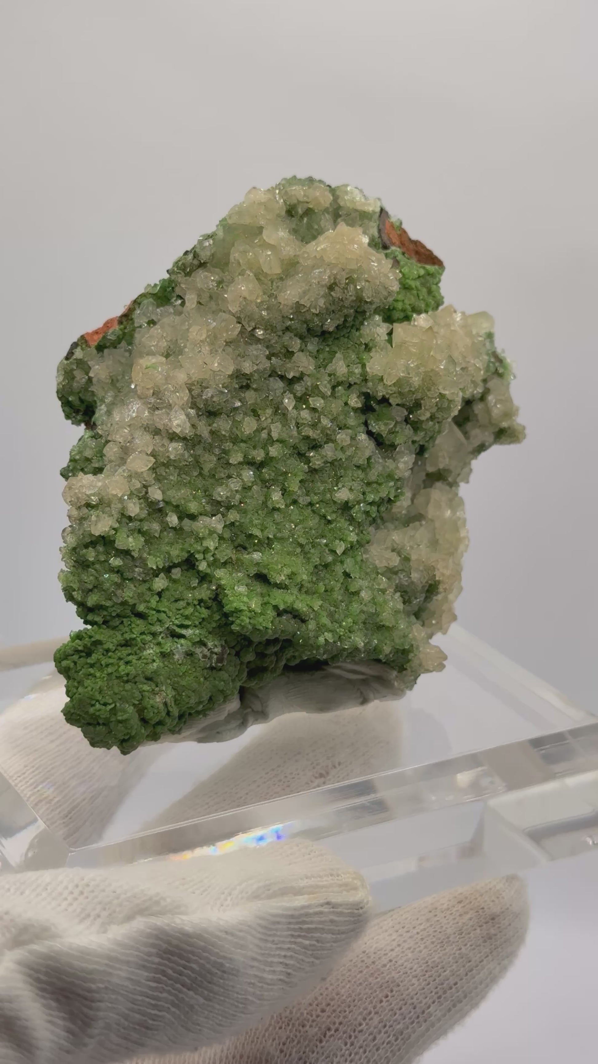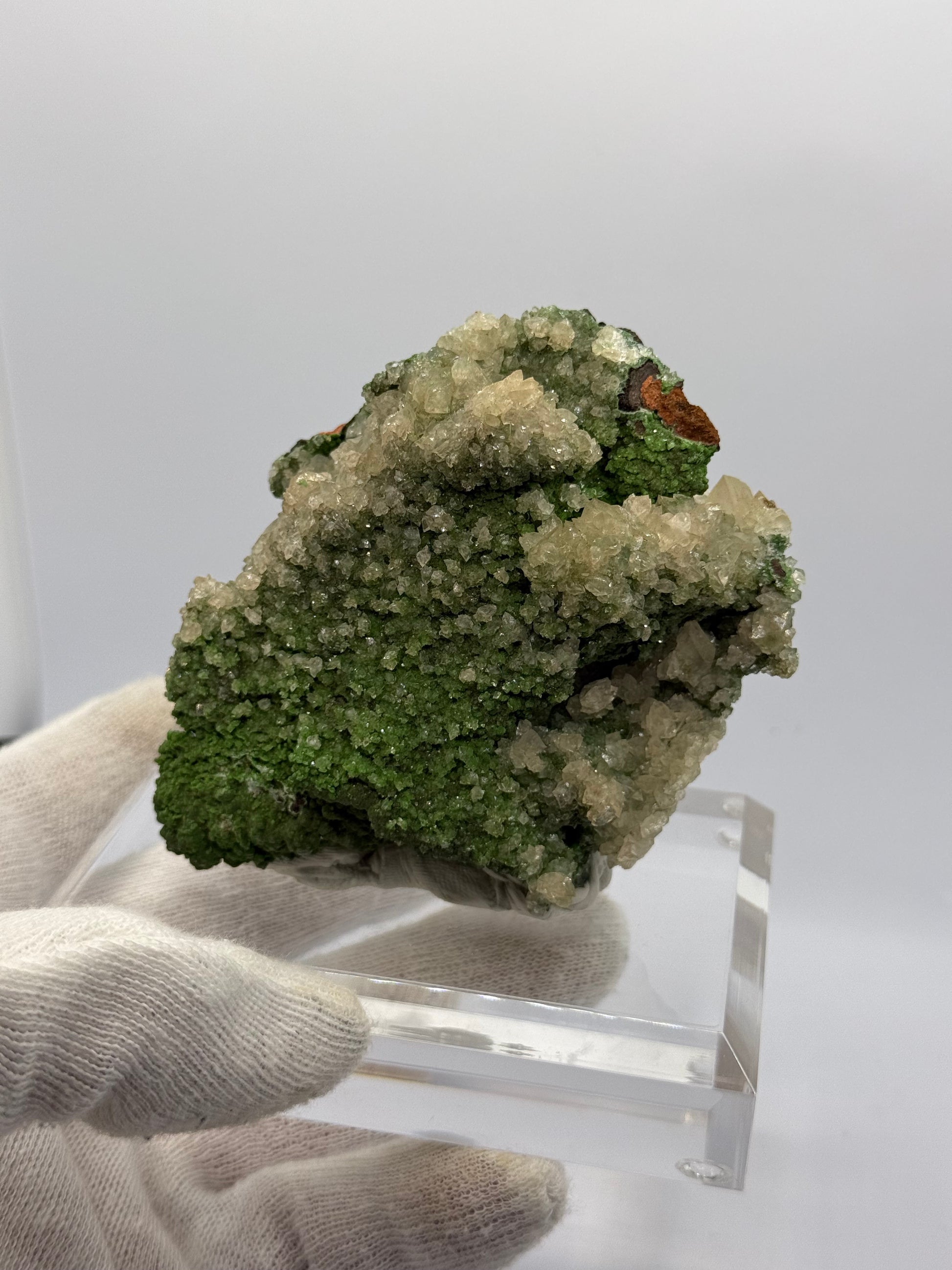 Fantastic Calcite on Conichalcite specimen from Mina Ojuela, Mexico. Vivid green Conichalcite with nice crystal formation. *Acrylic base not included, sold separately.*