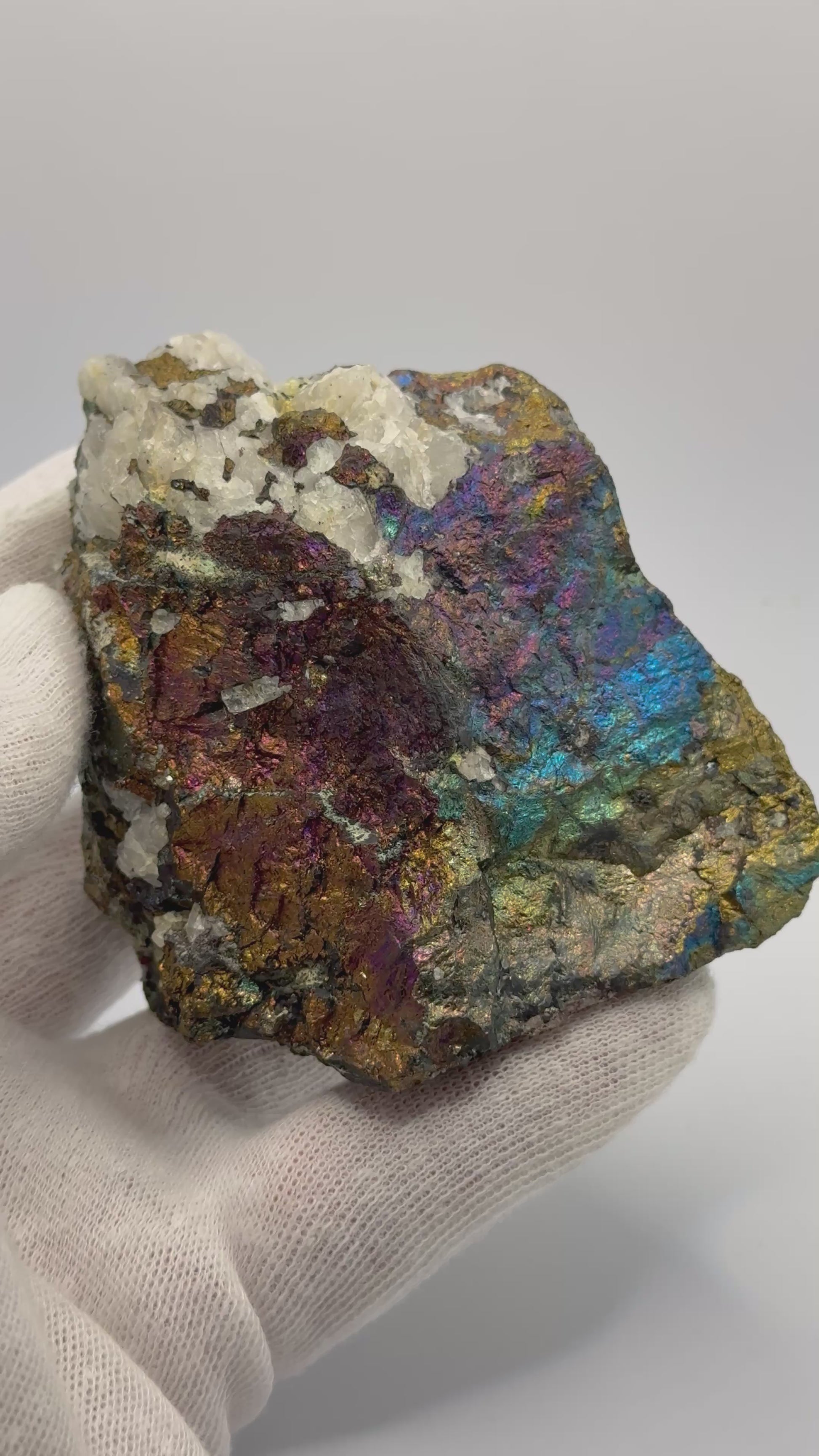 Super iridescent-rainbow specimen of Chalcopyrite and Bornite from Poona Mine, South Australia. Absolutely stunning colours of blues, greens, golds, purples and oranges! Ex Michael Grasso Private Collection piece.