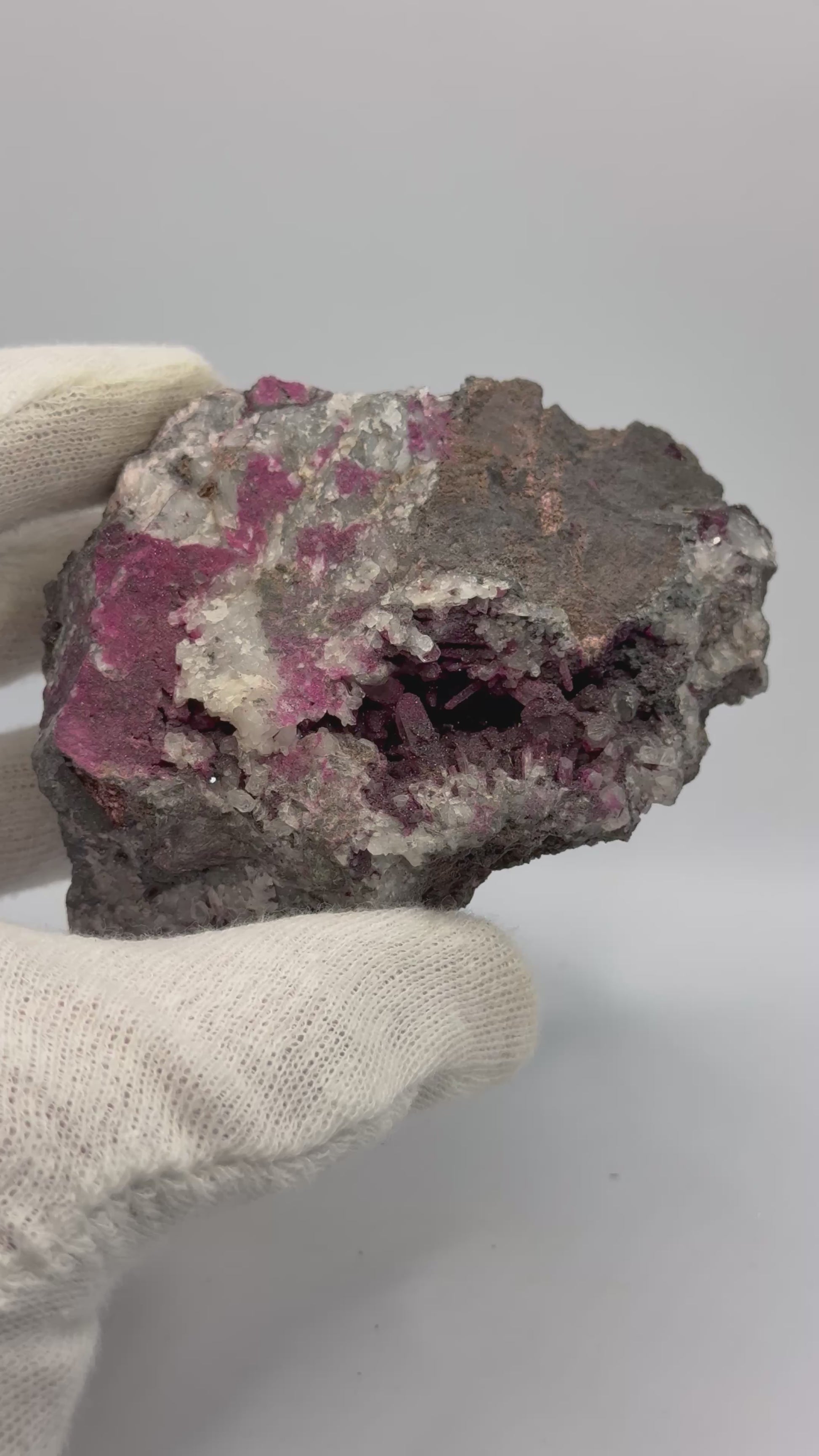 A stunning specimen of sparkly Erythrite and Quartz from Morocco. The Erythrite coats a majority of the Quartz crystals in their cave like fashion formation. The pocket of Erythrite and Quartz protrudes through the specimen and out the back. A truly stunning and unique specimen worthy of being in anyone's collection!