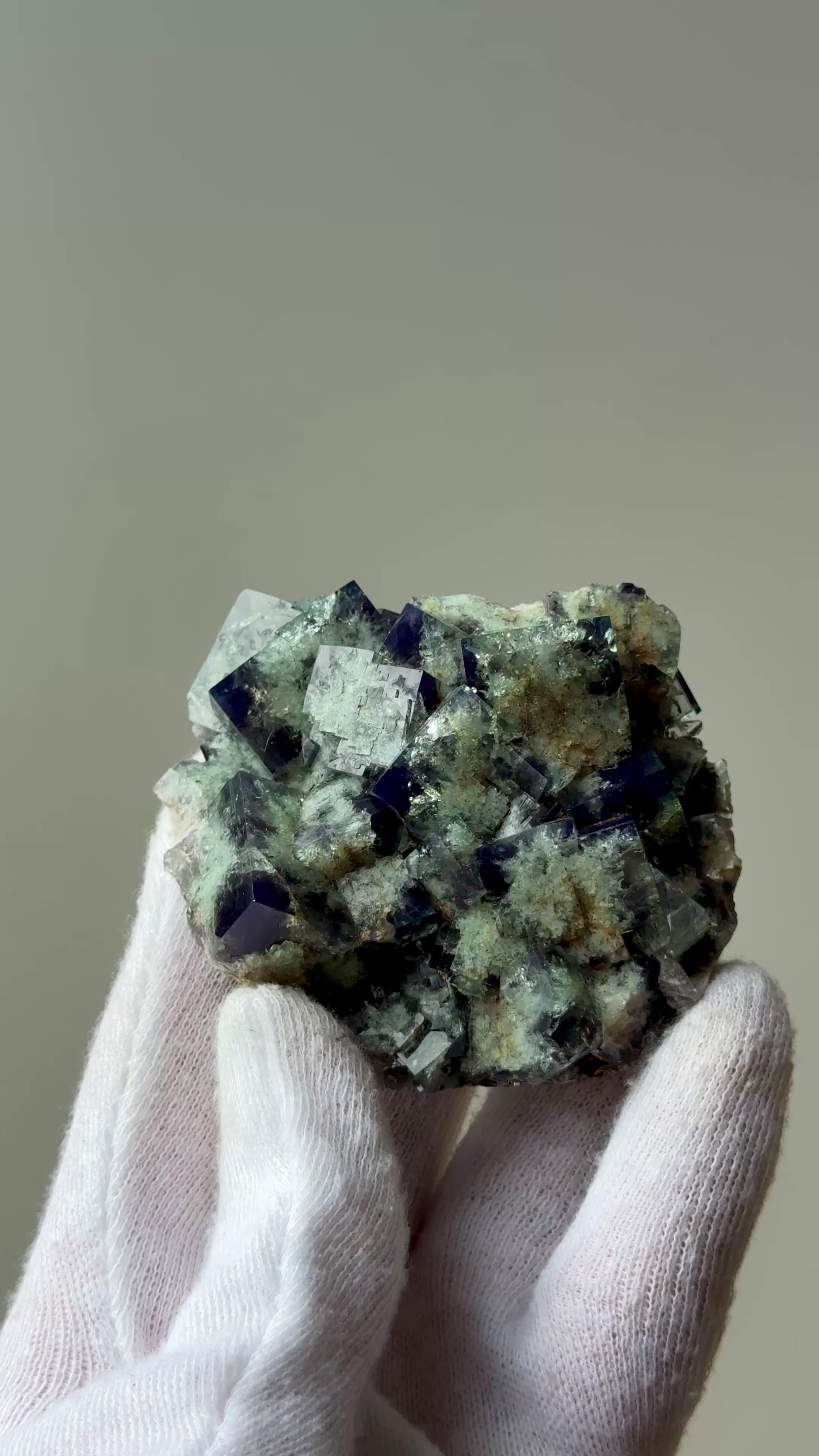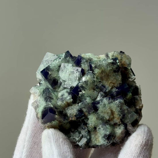 Fluorite "Truffle Pig Pocket" from Diana Maria Mine, England. It presents as Green under no UV and exhibits a strong daylight fluorescence turning a deep dark-blue in natural daylight.