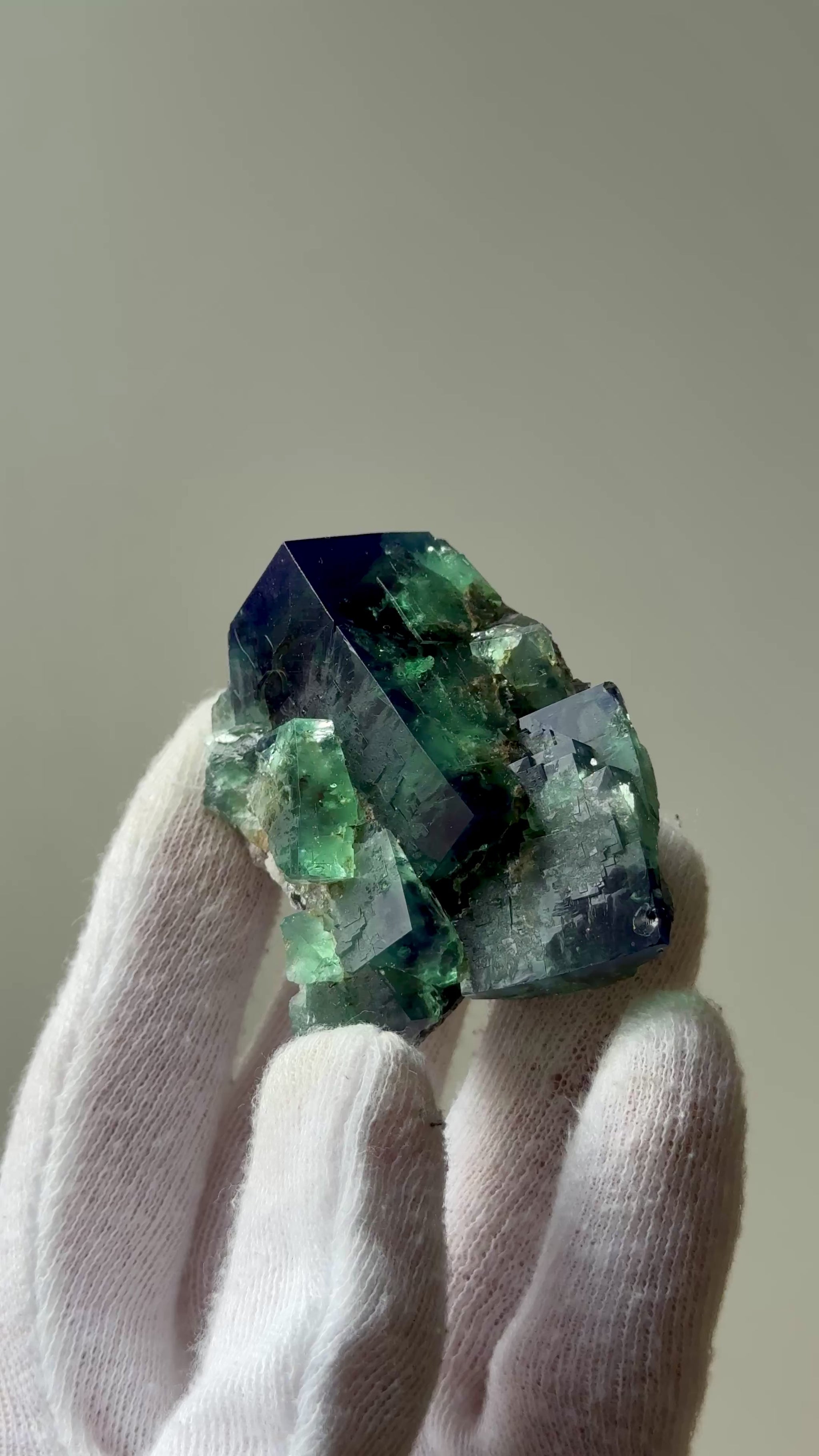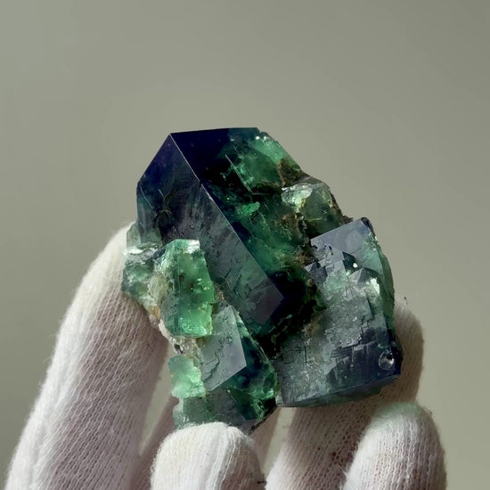 Fluorite "Truffle Pig Pocket" from Diana Maria Mine, England. It presents as Green under no UV and exhibits a strong daylight fluorescence turning a deep dark-blue in natural daylight.