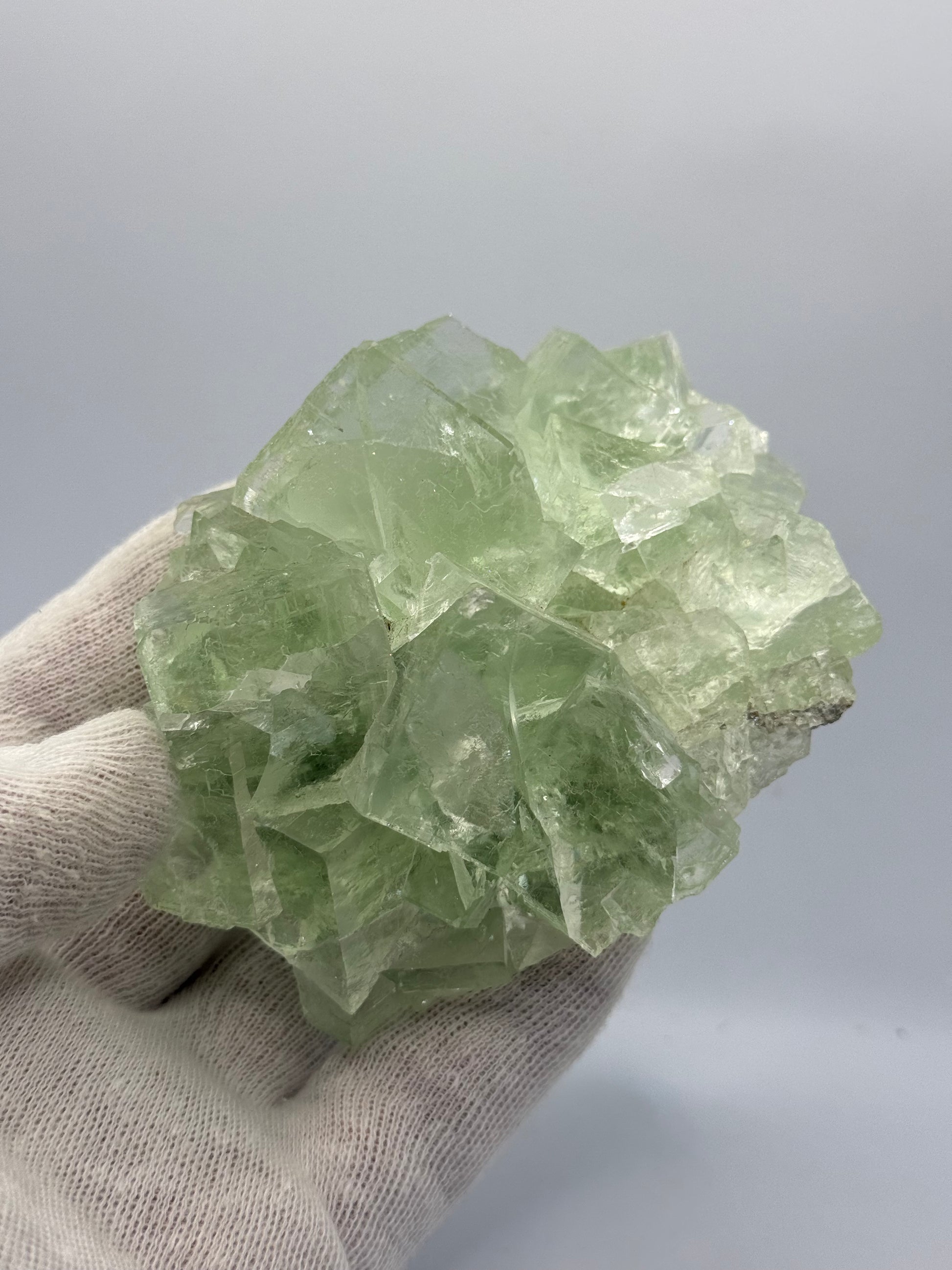 Nice sized transparent Light Green Fluorite from Hunan, China. Has some nice etchings on the larger crystal faces.