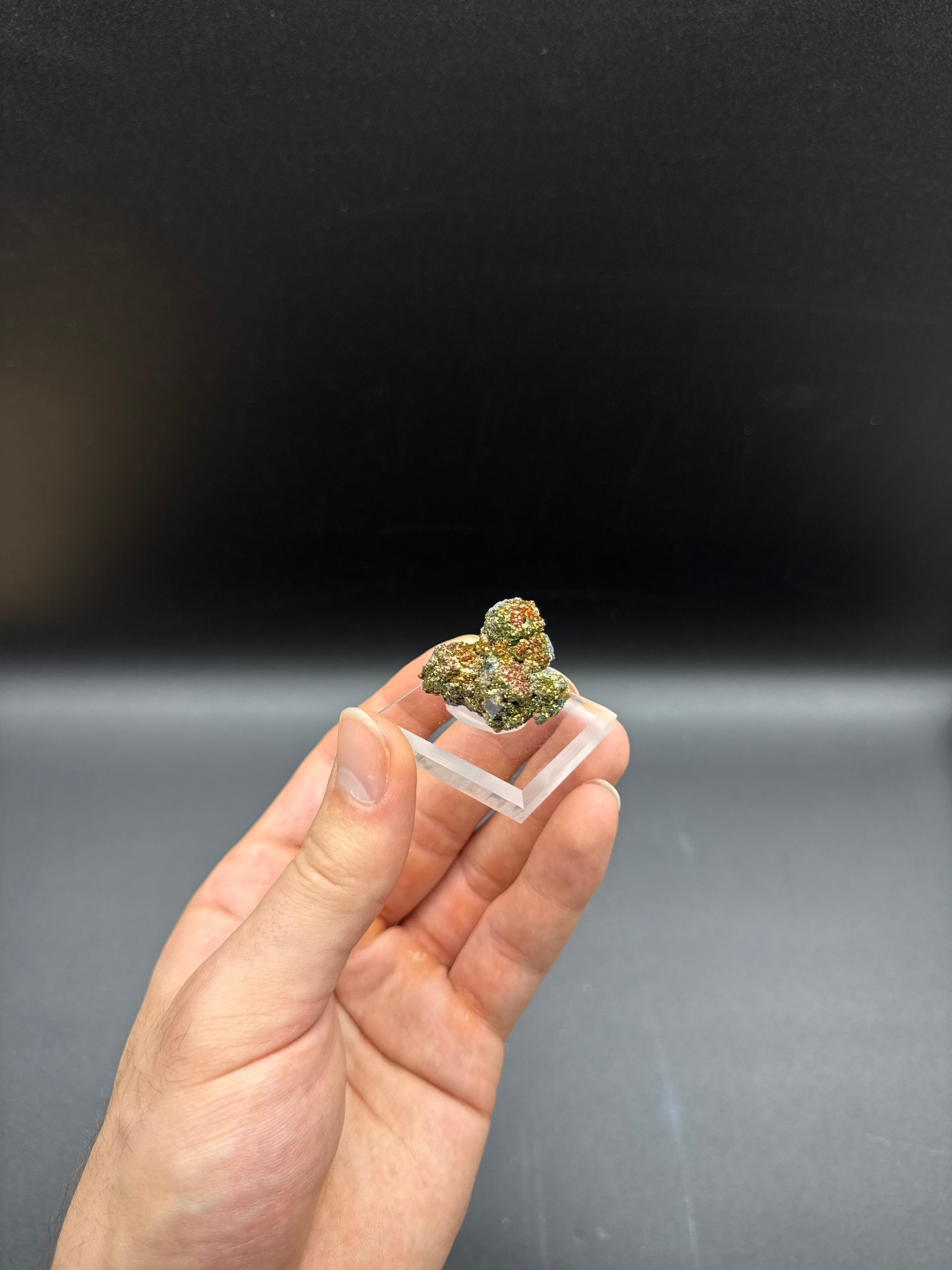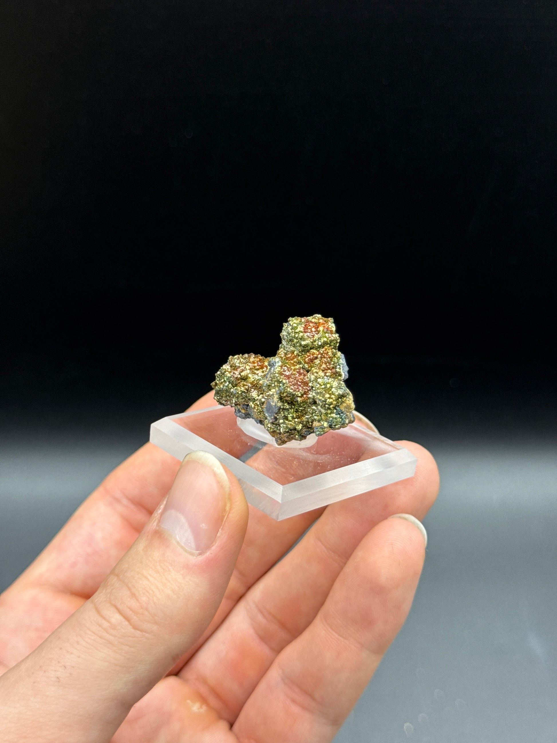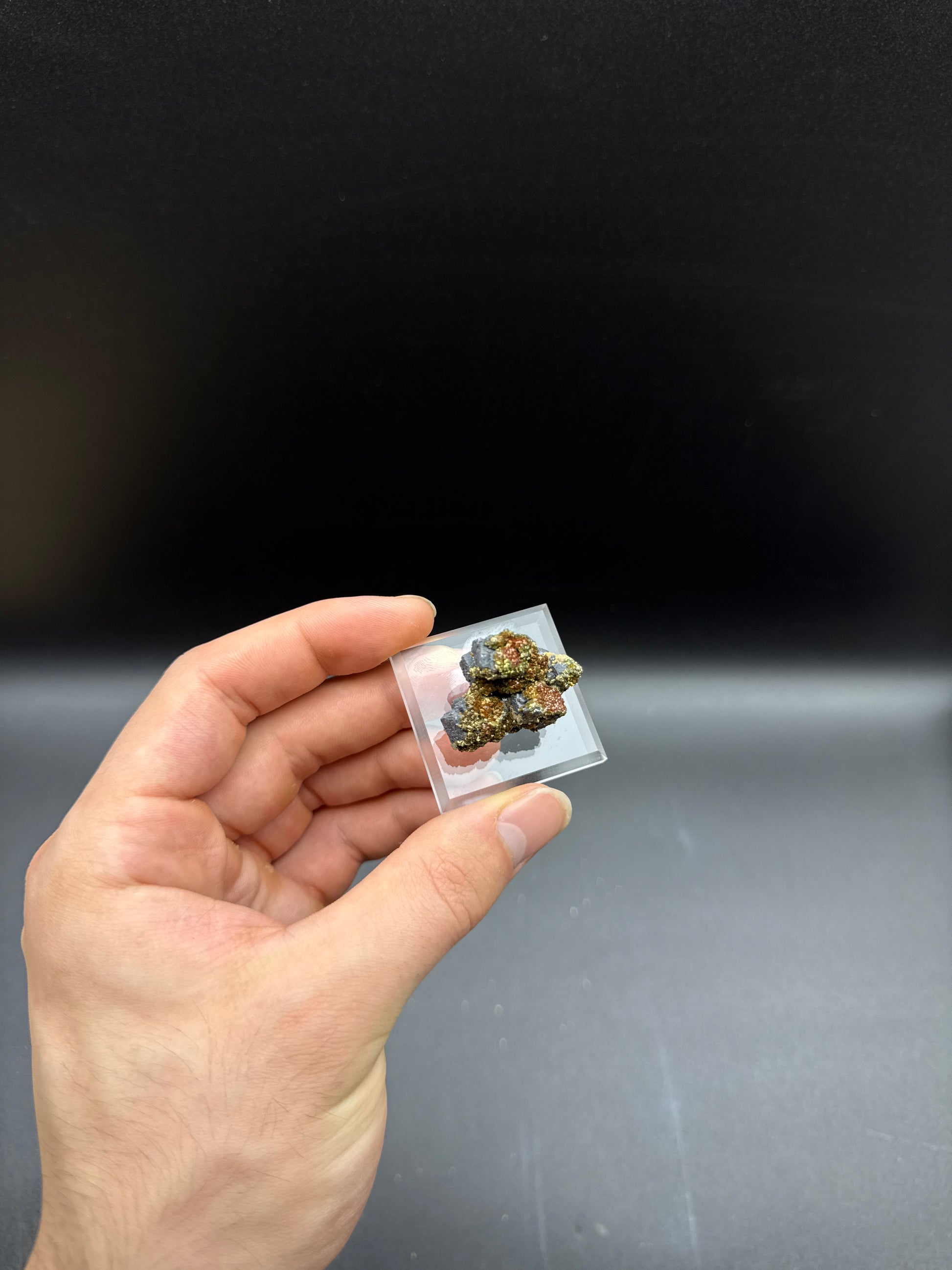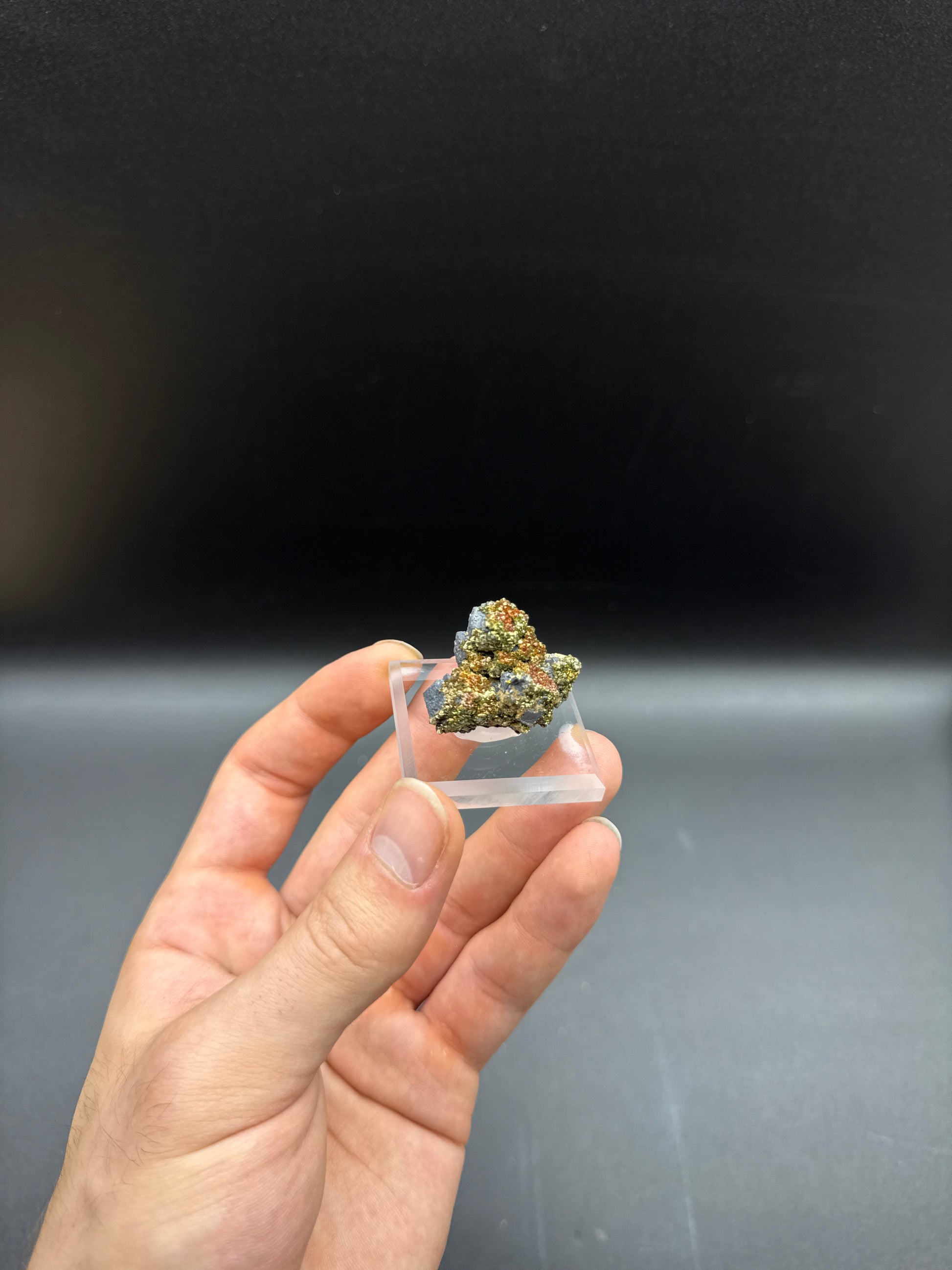 Beautiful red-gold Marcasite on Galena from Cadjebut Mine in Western Australia. Ex. Craig Bosel Collection. Specimen is glued onto the base.